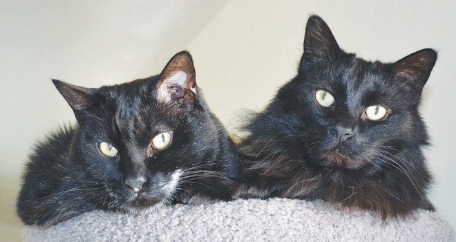 When they arrived at Miss Kitty’s adoption, they appeared to be one huge black lump cuddled in the farthest corner of their new abode, well hidden under a cat tower. They protected each other. Their previous owner, Father Norman, had left them at his home at Sacred Heart Church while he travelled to Cincinnati on a church assignment. Sadly, he never returned home as he had passed away after a fatal auto accident.